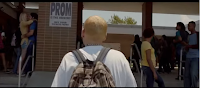 There is then a medium over the shoulder shot of one of the main characters. This creates a narrative enigma as we can only see the back of the character. This introduces the audience to the character but also illustrates to the viewers, more of the setting. The mise en scene is also used appropriately and effectively as the character is wearing casual clothes which make's him look as if he is one of the students at the school. This is believable as they are undercover and need to remain in disguise.